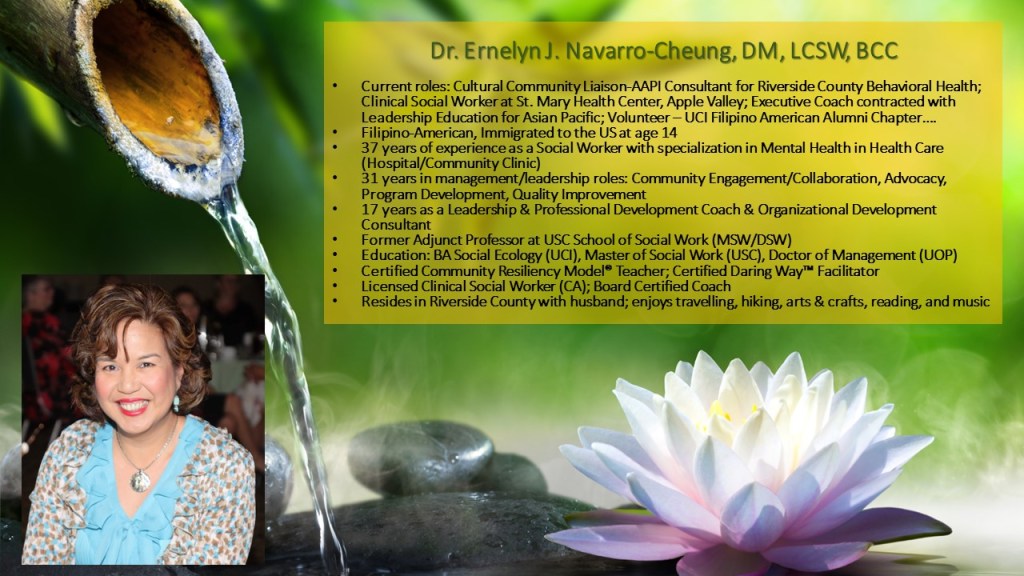 Here’s a friendly reminder to join our Riverside County NOW Zoom meeting, Thursday, September 29, 2022, at 6:30 pm. Our guest speaker will be Dr. Ernelyn J. Navarro-Cheung DM, LCSW, BBC. Dr. Navarro-Cheung will discuss her various endeavors which include providing mental health services to everyone in Riverside County. Her efforts bring communities together.